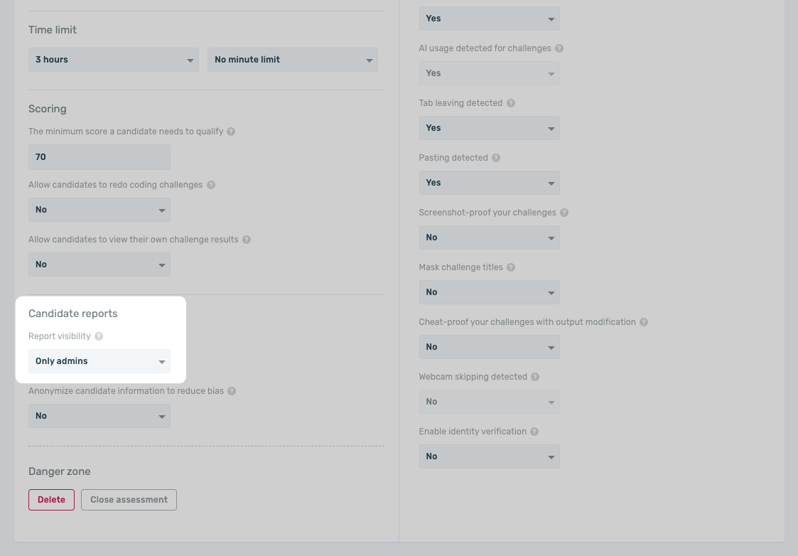 You can change this setting by clicking Edit on any Assessment. Then, navigate to the (1) Settings tab and find the (2) Candidate Reports header. Select Only admins for Report visibility so only admins can view them.
