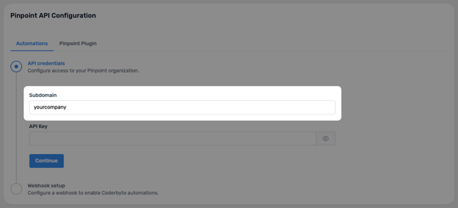 Step 2: In Coderbyte, navigate to Integrations -> ATS and select Pinpoint. Enter your Pinpoint subdomain in the first field: