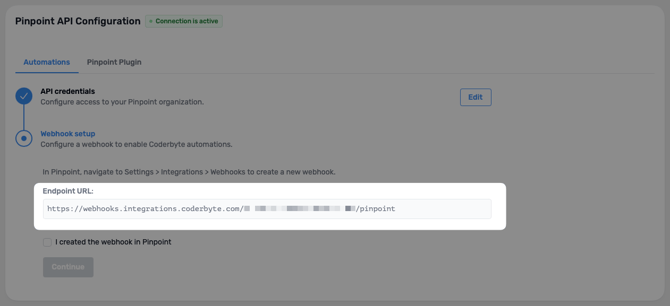 Step 6: In Coderbyte, check the "I created the webhook in Pinpoint" box and click Continue.