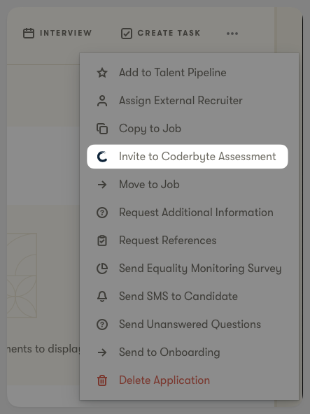 Step 1: Open a candidate profile in Pinpoint and select "Invite to Coderbyte Assessment" in the menu:
