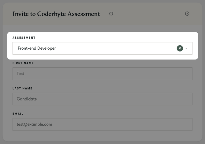 Step 2: From the list of your Coderbyte assessments, select the assessment that you want to invite the candidate to. The name and email fields are already prefilled by the system and cannot be changed: