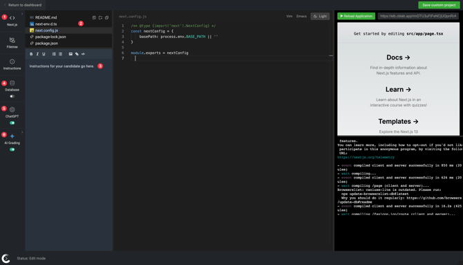 2. Filetree: Add and hide files from candidates or make them read-only. Then, when candidates take this challenge, the passing/failing logs can appear on the right side as feedback.