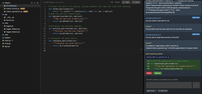 If you toggle the mode from Chat mode to Agent mode, then you are able to have an agent make edits for you in the codebase. Files can be modified and will have a small tag next to them so you know which were added or modified via AI, and then any code changes require approval from you before the code is actually updated, see example below: