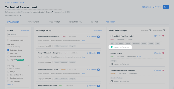 For assessments, you can enable video explanation to ensure that (i) candidates are who they say they are and (ii) that the candidate independently worked on their solution.