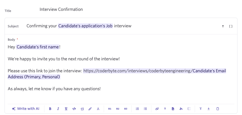- The resulting URL should look like: https://coderbyte.com/interviews/orgSlug/$Candidate.Email