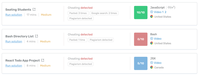If a candidate cheated, we provide several automated and manual detection methodologies. The following are how we display automated cheating detection: